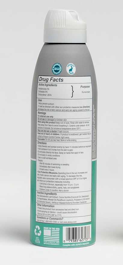 Aloe Up Sport Continuous Spray Sunscreen SPF 15 - Broad Spectrum UVA/UVB Sunscreen Protector for Face and Body - With Aloe Vera Gel - Fast Absorbing Sheer Formula - Reef Safe - Fragrance-Free - 6 Oz