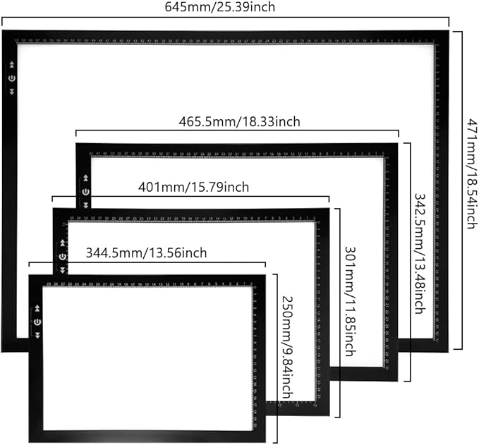 - Easy Carrying -- A4 Size Super Slim Trace Drawing light box with 0.23’’ Aluminum Frame is Sturdy, Light Guide Board make The illumination is perfectly even, super bright, and flicker-free, Overall dimension including Black Frame: 13.56”x 9.84”, Visual area: 12” x 8.27”