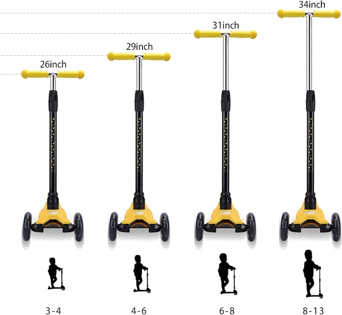 - Adjustable scooter: Our scooter for kids design with 4 adjustable height options to accommodate ages 3 to 13 years old. Kids can hold the handles of the scooter comfortably.
