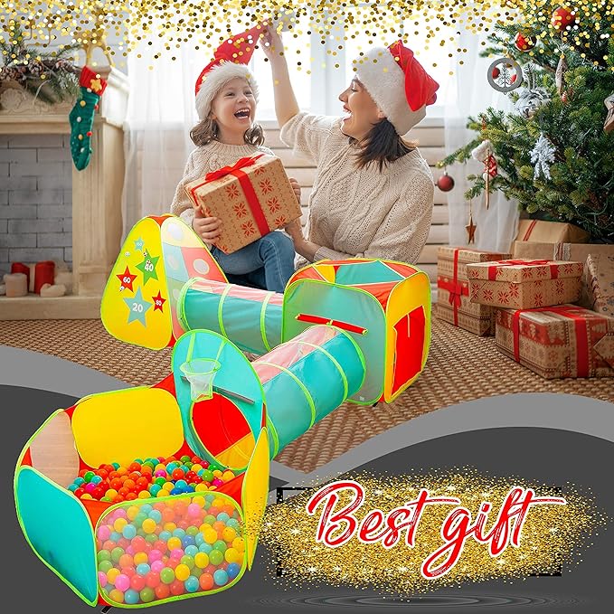 - UNLEASH YOUR CHILD'S IMAGINATION: Kiddzery's 5pc Kids Play Tent offers endless creative play opportunities for toddlers. With its colorful ball pit and thrilling crawl tunnel, your child will dive into adventures, sparking creativity and boosting motor skills in a playful environment. 5-in-1 playset includes 2 play tunnels, 1 square ball pit, 1 ball pool with a basketball hoop, and 1 Teepee-shaped ball pit with 3 sides.