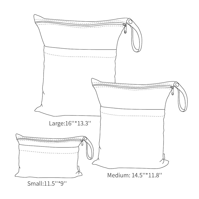- Enough Space-Large bag: L16''*W13.3'',can hold up to 10-12 diapers; Medium bag: L14.5''*W11.8'', holds up to 8 diapers; Small bag:L11.5''*W9'',can hold 3-4 diapers. Large and medium bag for baby diaper,swimming suits ,clothes, gym clothes and more. Small bag for your toiletries, bits and undergarment,cosmetics, socks and other belongings