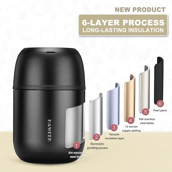 - 【Easy to Open】2 in 1 insulated food jar with a folding spoon, 1 user manual. Notice: Pour in hot & cold water to preheat & pre-cool for 5~10 minutes before packing food.