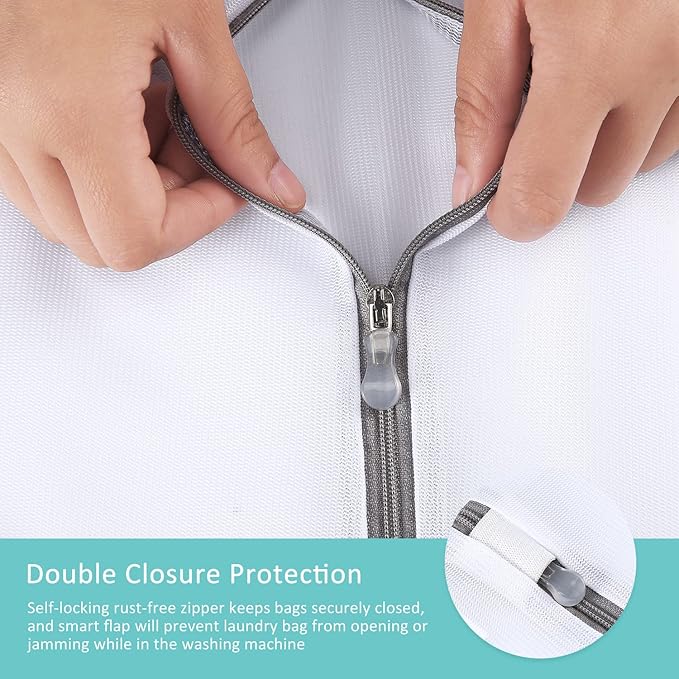 - Upgraded anti-rust zipper with auto lock feature and side small zipper cover will keep the bag closed when washing and drying. You'll have a new quiet and a snag-free laundry experience. Remember to tuck the zipper under the cover when doing laundry
