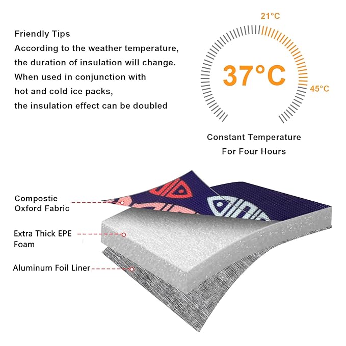 - HIGH QUALITY MATERIALS: Made of high quality water-resistant composite oxford fabric, 8mm extra-thick EPE foam and food-grade aluminum foil liner. No odor, non-toxic, food safe, durable, lightweight. Effectively keep bottles stay cold, warm or fresh for hours, it keeps breast milk fresh.