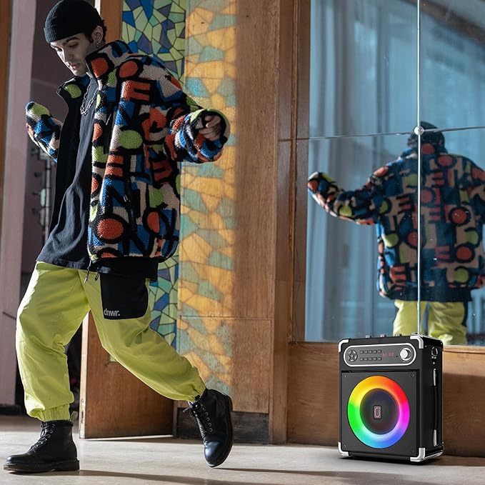 - 【Karaoke Machine with Cool Disco lights】The partybox have a unique disco lighting design. The lights can jump with the rhythm of the music, and you can also switch to a variety of lighting effects for any party or gathering to create a cool dynamic atmosphere. You can enjoy the light show while listening to your favorite music, giving you an unforgettable karaoke experience.