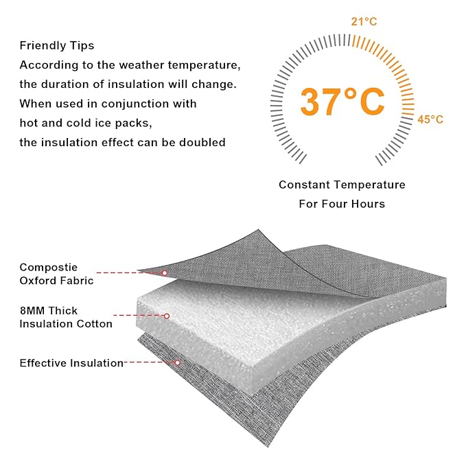- HIGH QUALITY MATERIALS: Made of high quality water-resistant composite oxford fabric, 8mm extra-thick EPE foam and food-grade aluminum foil liner. No odor, non-toxic, food safe, durable, lightweight. Effectively keep bottles stay cold, warm or fresh for hours, it keeps breast milk fresh.