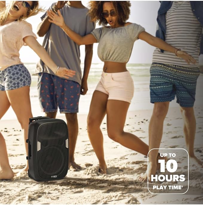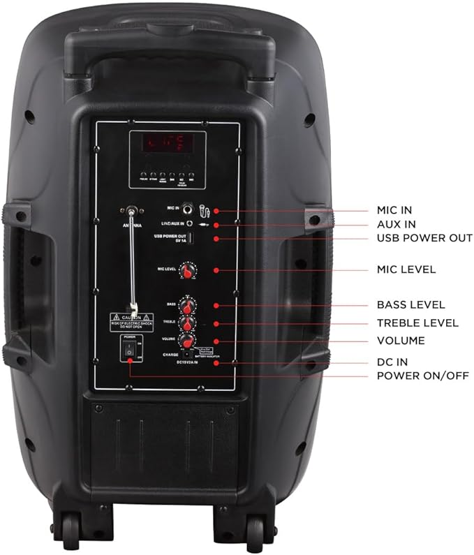 - Carrying Handle: The built-in carrying strap makes this speaker a breeze to bring from one party to the next! It even has wheels so you can simply roll it around with ease!