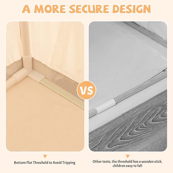 - ✨ANTI-TRIP DESIGN:Our children's tent is different from other tents in that the door is designed to be invisible threshold. Tent bottom close to the ground, children in and out of the tent will not trip or fall, very safe and reliable. Generally, the threshold of the tent door is a stick or a round pipe. When the children get in and out, they are likely to get wrestling.