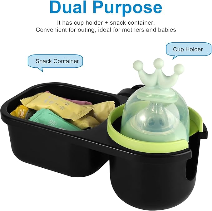 - The 2 in 1 multifunctional holder includes a snack catcher and drink holder for snacks on the go. Ideal for mom and baby.