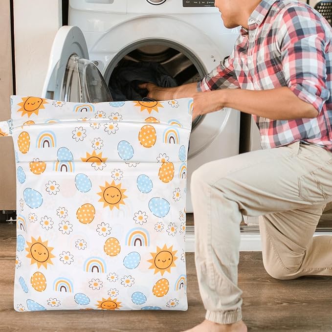 - 2 ZIPPERED POCKETS & HANDLE DESIGN: The 2 pack laundry bags are designed with 2 zippered compartments to keep wet and dry clothes separately, or separate dirty and clean diapers. Keep dry and clean. There's a handle with a button on one side for hanging up, convenient to carry and attach to your stroller, doorknob, towel rack, hook or handbag.