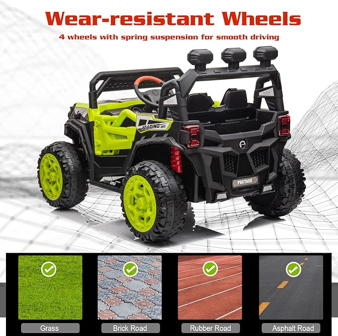 - 24V BATTERY POWERED 4WD RIDE ON UTV- Equipped with 24V 7Ah rechargeable battery and 4 powerful motors, this ride on UTV is powerful enough to provide a long using time. The 4 wear-resistant wheels with spring suspension can provide a smooth driving with the speed of 1.85-3.1mph on different terrains