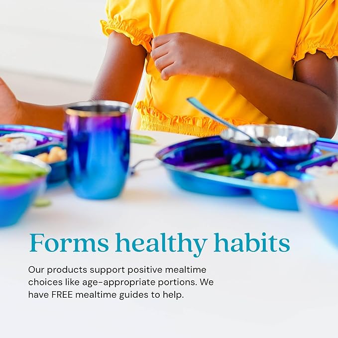 - Kid Approved — Ahimsa Mindful Mealtime Sets make mealtime fun with vibrant and colorful stainless steel kids plates that children adore. Included is a stainless steel toddler plate with dividers, a 8 oz. kids stainless steel cup and small baby bowl, and kids silverware (1 kid fork, 1 kid spoon).