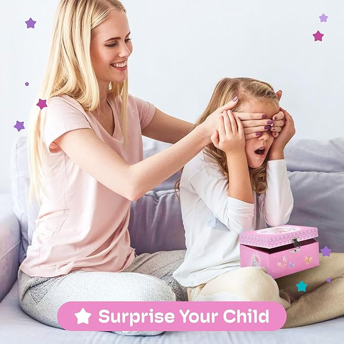 Jewelkeeper Unicorn and Butterfly Themed Jewellery Box Pink for Girls - Wooden Jewelry Box with Velvet Lining for Little Girl's Necklaces and Accessories - Spinning Unicorn Doll, Toys for Girls