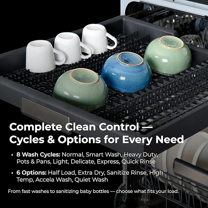 - Roomy Interior & Adjustable, Removable Rack: Fit up to 15 place settings or just a few items using the Half Load option. The MoreSpace Adjustable Upper Rack raises or lowers to make room for pots, tall items, or delicate stemware