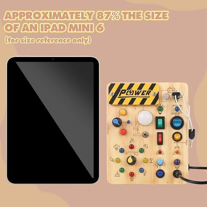 - [ Montessori Busy Board for Toddlers ] Our busy board is placed different complexity switches, which include light bulbs that match the light of the switch. There are 10 different switches and 19 LED light bulbs set on this busy board. This sensory board will help your children enjoy hours of entertainment. Requires 2 AAA batteries (batteries not included).