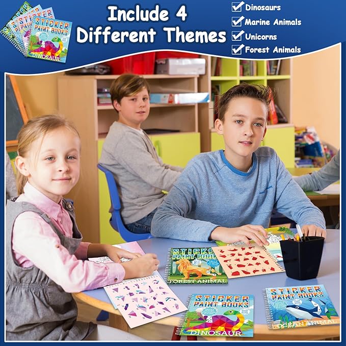 - 【Sticker Paint Books for Kids】Paint by sticker set consists of 4 books for kids 4-8, each containing 8 pages of unique images. In total, there are 32 pictures for you to complete. The book themes encompass dinosaurs, marine animals, forest animals, and unicorns. With a diverse range of themes and an abundant supply of stickers, this set is guaranteed to fulfill all your creative requirements.