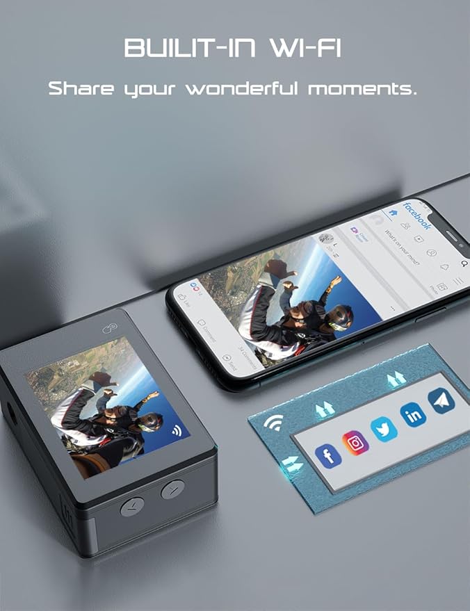 - 📸【40M Waterproof and 2.4G Wireless Remote Control】The included waterproof case protects Apexcam underwater camera from diving to depths of up to 40 meters perfect for swimming, diving, surfing, snorkeling and motor boating. The 2.4G wireless remote control allows you to freely control the camera when you mount it on a helmet, bicycle or other device.