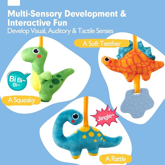 - Baby-Safe Designs: Made from non-toxic, BPA-free, premium PP cotton, our dinosaur car seat toys are ultra-soft, skin-friendly, and safe for babies and infants. Strong stitching ensures durability and safety during play