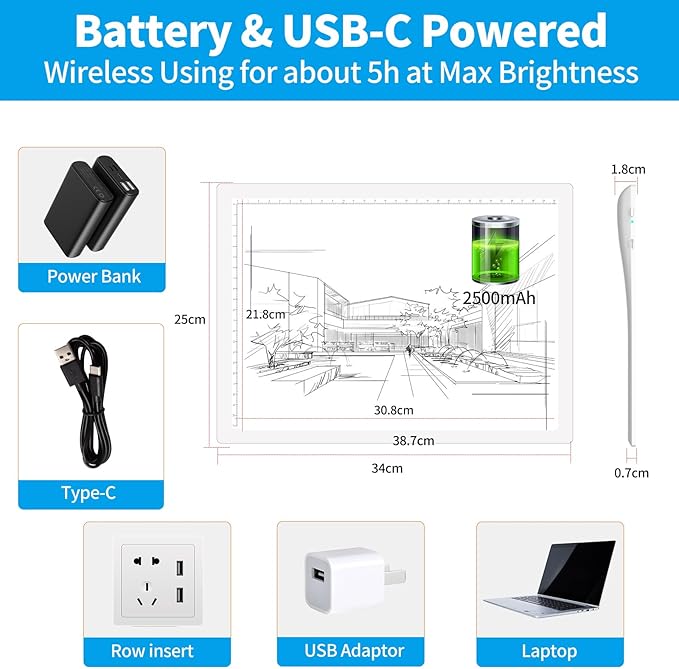 - 【 Built-in Battery and USB-C Powered 】 Our LED lightbox comes with a internal battery which allows you to use it any where without any power source, which makes your project more convenient as well as more enjoyable! Works for around 5 hours after charged 1.5 hours at a time. This A4 lightpad uses a USB-C interface to easily access any USB port, such as a USB wall charger, computer, laptop or mobile power bank. Also,the USB-C interface is more stable than the Micro interface.