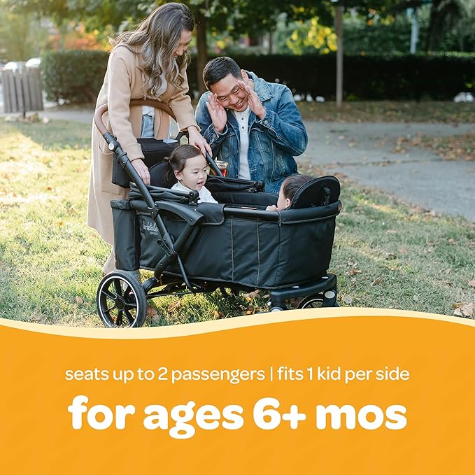 - Spacious 2-Seater Stroller Wagon: Seamlessly expands from a single-seat wagon to a double-seat wagon in seconds with no tools needed - the second seat is included! Featuring a drop-down footwell that can be covered when flat seating is needed.