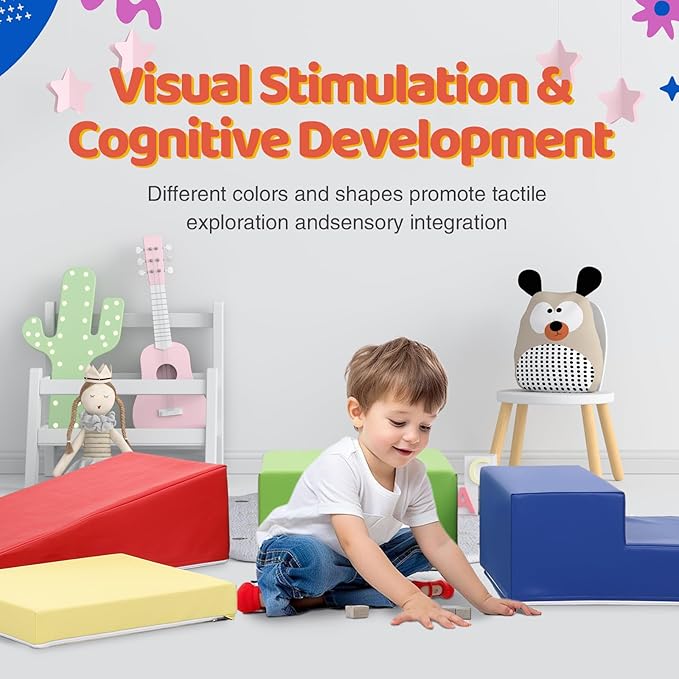 - 4 PIECE SET: A square, a slide, a fan, and a stairs all cover with leather make up our foam play gym set. Different shapes stimulate toddlers' visual development and imagination, allowing them to stack and combine freely