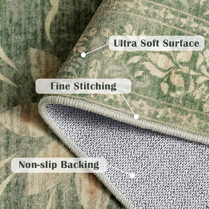jinchan Vintage Floral Runner Rug 2x6 - Machine Washable Distressed Design Non-Slip Low-Pile Soft Thin Carpet for Hallway Kitchen Farmhouse Bedroom Entryway Laundry Room (2x6ft,Dark Green)