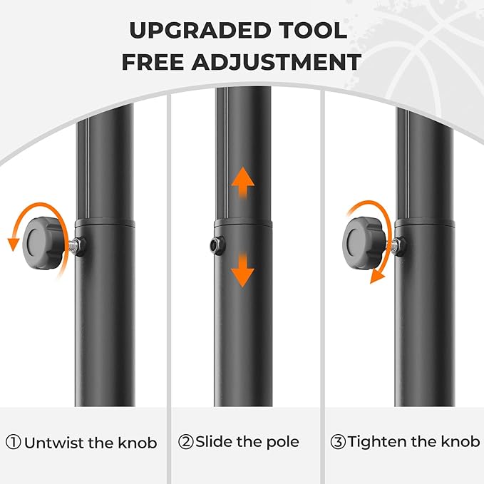 - 【3.6-7FT Easy Adjustment】Built to last and adjustable from 3.6-7 feet, the basketball hoop for kids is perfect for growing children. Two mouting height options that you can choose one suiting you best: three-pole installation heights range from 5-7 feet and two-pole installation heights range from 3.6-4.8 feet. You can have a quick and easy adjustment by simply loosing the knob and sliding the pole to the desire height, no tools required and ready to adjust.