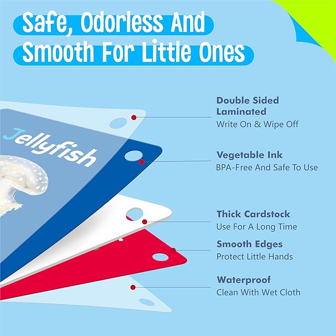 - Well Made: The card adopts sturdy and thickened cardstock with PET film on both sides, durable and tear resistant. Printed with premium non-toxic vegetable oil-based ink, BPA-free and safe for kids to use. Bright colors and cute designs catch kids’ eyes and evoke a sense of excitement and joy. When children are surrounded by these colorful flashcards, they are more likely to be engaged and interested in what they are learning.