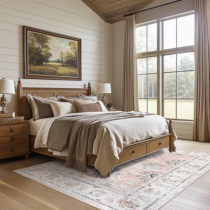 jinchan Washable Area Rug 5x7 Ultra-Thin Low Pile Non Slip Stain Resistant Soft Faux Wool Spring Floral Distressed Vintage Carpet for Bedroom,Living Room,Dining Room,Kitchen,Nursery(Pink, 5' x 7')