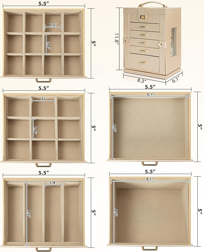 - 【Large Capacity,More Storage Space】With 6 versatile pull out drawers, and additional ring and earring storage at the back,this black huge jewelry box can store a lot of jewelry accessories, such as rings, earrings, necklaces, chains, bracelets and so on. One deeper drawer is designed for watches,sunglasses or large jewelries.