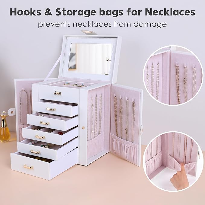 - Elegant Jewelry Organizer with Soft Pink Velvet Interior: Refine your jewelry storage with our beautifully crafted organizer, featuring a chic white exterior and plush pink velvet lining. Perfectly sized for essential pieces, it includes several drawers, side doors, and a top compartment with a mirror, suitable for organizing necklaces, earrings, bracelets, and rings.