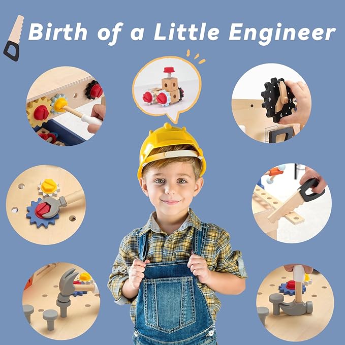 69‑Piece Wooden Kids Tool Bench – Montessori Toddler Workbench with Pretend Power Drill, Clock & Storage Shelf – STEM Construction Play Set for Boys & Girls Ages 3‑5