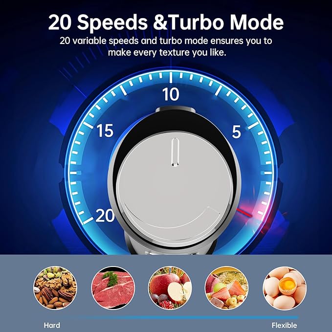 - 20-SPEED TO CREATE ANY TEXTURE YOU LIKE: In comparison to the 2-speed other brands offer, our hand mixer features 20 speeds( Low to high), giving you greater flexibility and maximum choice to prepare smoothies, baby foods, soups, shakes, and more. A separate Turbo Button is used to blast ice faster and better.