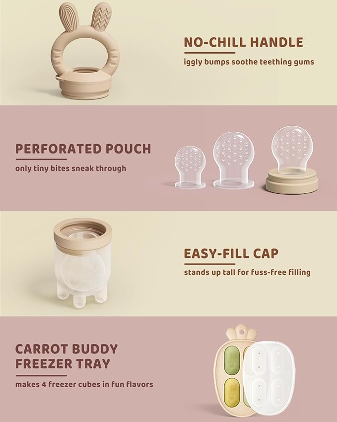 - 【Multi-size replaceable silicone nipple pouches】The combo food feeder provides 2 different sizes of pouches that serve your babies from 4 to 12 months. The nicely shaped pouches are easy to chew and help soothe baby’s sore gums.