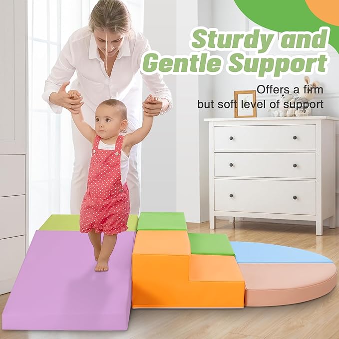 - 6-Piece Set: Baby climbing blocks consists of 1 yellow half-moon, 1 blue half-moon,1 orange stair, 1 green stair, 1 grass green square and 1 purple slide. This soft play equipment stimulates your child's imagination to create endless combinations of structures, allowing them to enjoy the fun of the toy as they climb up and down, stacking and swapping four different shapes. Our climbing sets have a unique patented design that your child is sure to love