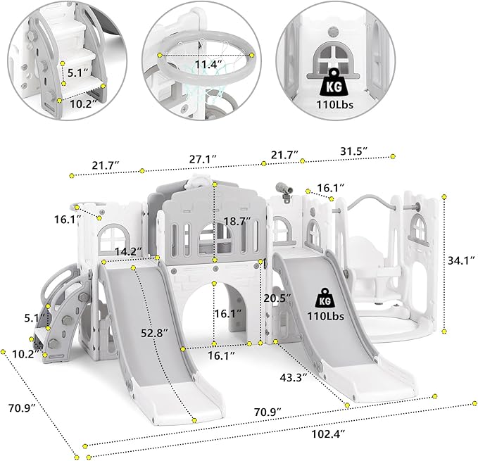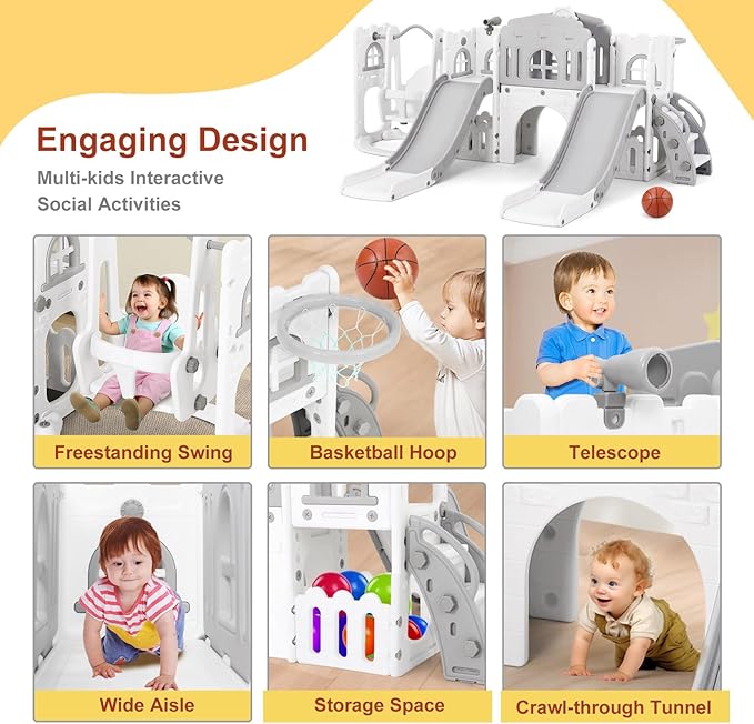- 【10-in-1 Multifunctional Playset】JOYLDIAS 10 in 1 toddler slide set has 10 activity areas, including double 2 slides, basketball hoop, storage space and non-slip enclosed step, widened climbing ladder, crawl-through tunnel and telescope. It can exercise children's muscle strength, balance and coordination and make the reaction more agile. And add baby's fun during the play.