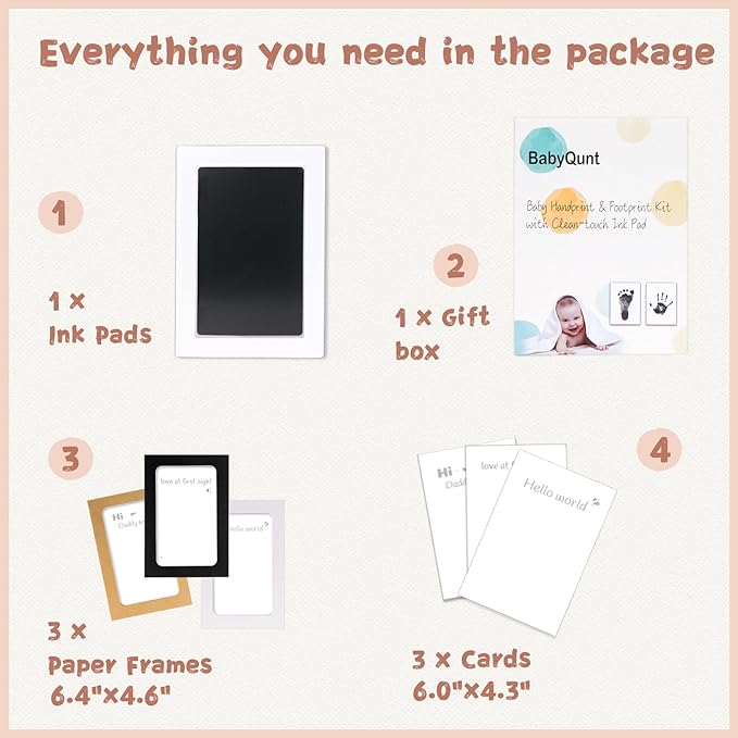 - 【Product Details】: Our baby hand and footprint kit measures 6.0"x4.2" with an ink window of 4.9"x3.1", which is the best size for recording hand and footprints of newborns 0-6 months old or pet paw prints . The ink pad for baby hand and footprints includes 1 clean touch ink pads, 3 stamping cards, and 3 display frames, ensuring you have ample opportunity to capture the best stamp.