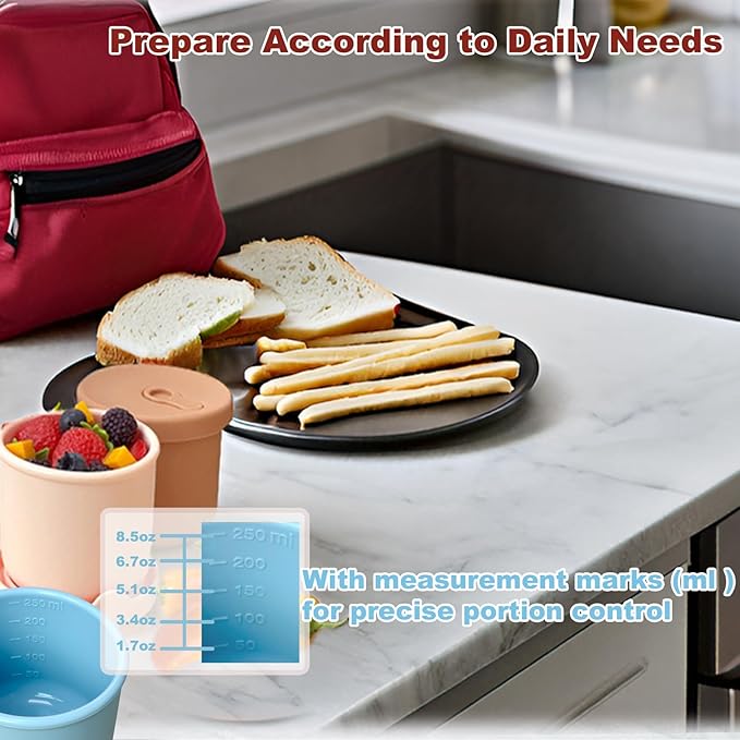 - What You Can Get: Package include 4pack 8.5oz silicone snack containers with lids. Perfect for kids schools and daycare. You can use the small silicone food storage containers to carry different snacks, like fruits, nuts, salad, sauce, homemade ice cream,yogurt and more