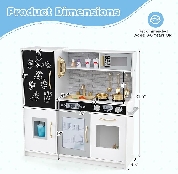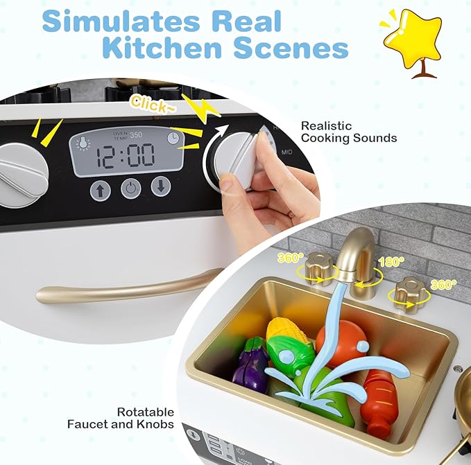 - 【Perfect Gift for Kids】Designed with a modern and stylish style, the pretend play kitchen is a great role play toy for children aged 3+ years old. The kid-friendly height makes kids enjoy hours of fun to develop hands-on ability, inspire creativity, improve social skills and enhance parent-child interaction.