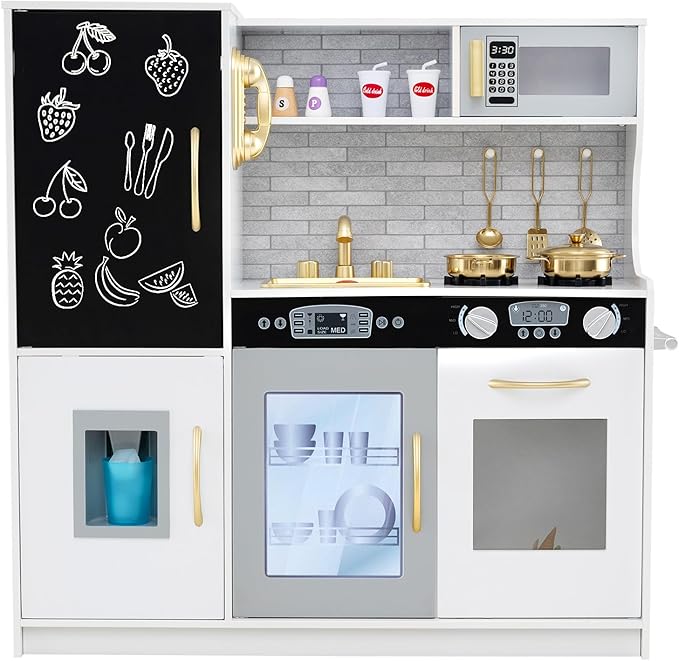 - 【Fun Chalkboard Surface】 With a built-in blackboard, this HONEY JOY kids kitchen playset allows kids to write down the menu today! Stylish backsplash with realistic microwave, fridge, freezer, and dishwasher adds a modern appeal and create an immersive play experience for children and kids.