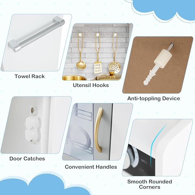 - 【ASTM & CPSIA Certified & Child Secure Design】Made of solid MDF material, this toy kitchen sets is stable and sturdy for long service life. What’s more, the equipped anti-toppling device attaches the kids play kitchen to the wall tightly, avoiding accidental falling.