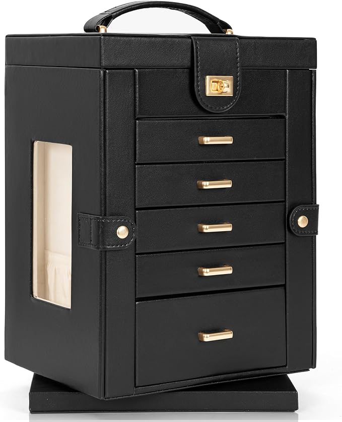 - 【Large Capacity,More Storage Space】With 6 versatile pull out drawers, and additional ring and earring storage at the back,this jewelry box can store a lot of jewelry accessories, such as rings, earrings, necklaces, chains, bracelets and so on. One deeper drawer is designed for watches,sunglasses or large jewelries.Material: Faux Leather,MDF (Medium Density Fiberboard),Velvet,Acrylic