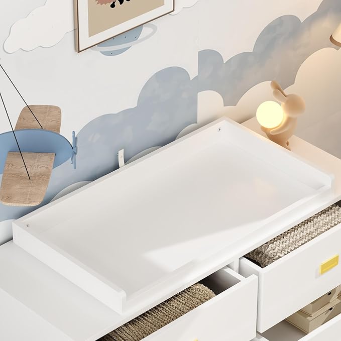 6 Drawer Baby Dresser, Nursery Dresser with Changing Topper, Long Cabinet for Infant Cloth Organize, Changing Station for Nursery and Kids Bedroom Storage, White (45.3" W x 18.9" D x 30.1" H)