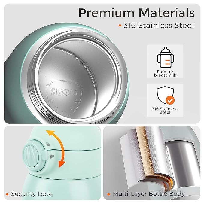 - Safe Materials & Mom-Friendly Design: Crafted from food-grade silicone accessories and 316 stainless steel. The secure safety lock and leak-proof plug prevent spills, ensuring peace of mind during travel. Portable baby bottle warmer includes a sponge brush to make cleaning effortless, helping you keep the bottle clean with ease