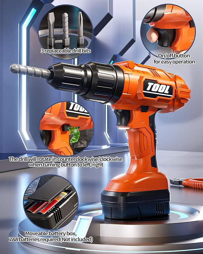 - 【2 in 1 Electric Drill & Electric Saw】With 2 replacement heads, the electric drill can be turned into an electric saw. Only 2 AA batteries are needed to simulate sounds and actions, allowing children to repair their own toys like dad.