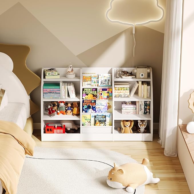 - Kids Bookshelf And Toy Storage:Tired of messy rooms? The FFBCFDK kids' bookcase helps children develop good organizational habits and keep their rooms tidy. The toddler bookshelf is large enough to hold a variety of items, including reading books, plush animals, balls, toy trucks, and more, creating a comfortable and inviting reading corner in any playroom or bedroom