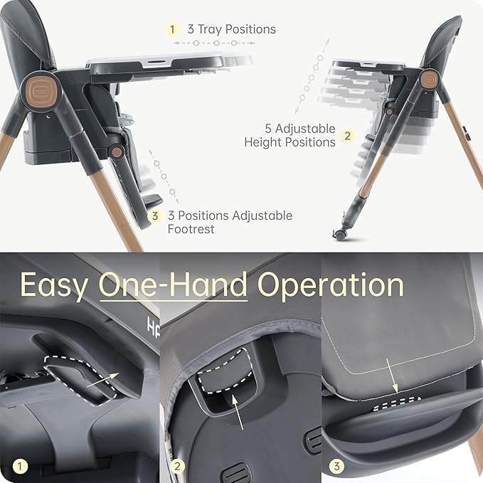 - Multifunction, Adjustable Design: The Foldable Highchair with 5 Seat Heights and 4 Reclining Positions, 3 Tray Positions, 3 Footrest Positions and 4 Leg Drag Positions to Adapt From A Convertible High Chair for Baby to an Adjustable High Chair for Toddlers, To A Big Kid Booster, And A Child Stool As Your Little One Grows.