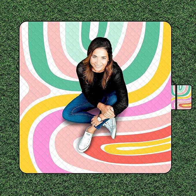 - Stylish Pattern to Stand Out: Featuring a unique and vibrant rainbow swirl design, the Adecor picnic blanket adds a fun pop of color to any setting. Bring style to the beach, charm to the park, or flair to your backyard setup.