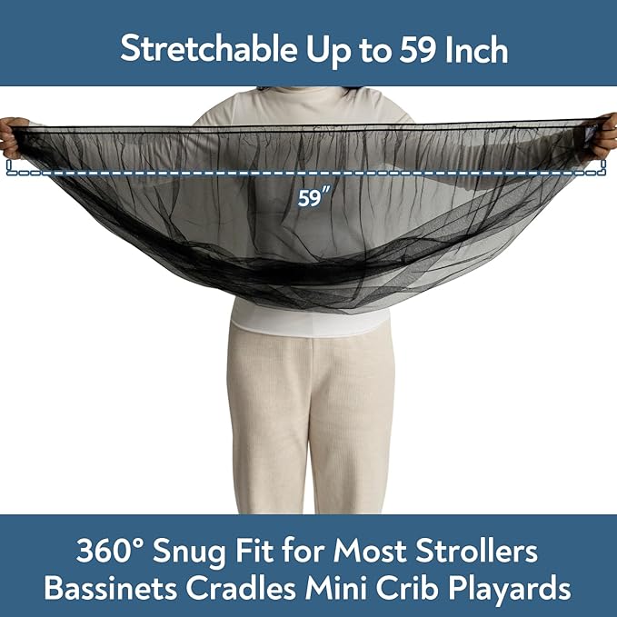 - Stretchable up to 59 inch in length - 360 snug fit for most strollers, baby carseat, bassinets, cradles, mini crib, playards, rocker chairs, bouncers and pack and plays.