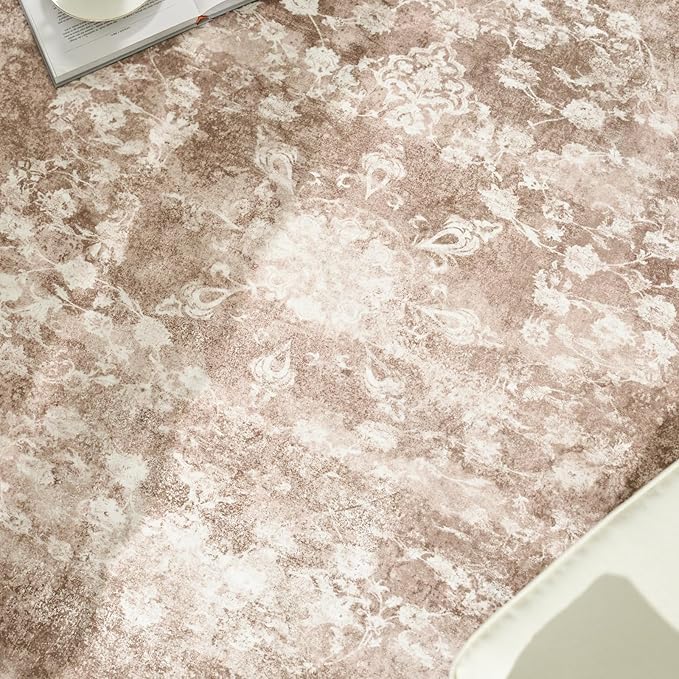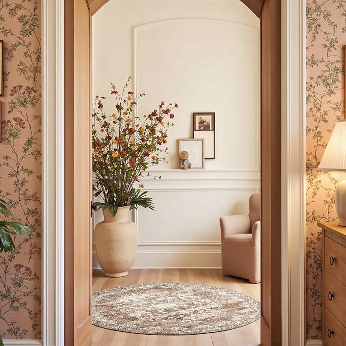 jinchan Round Rug 5ft Area Rug - Brown Vintage Floor Mat Kitchen Indoor - Washable Circle 5' Thin Floral Print Carpet Retro Farmhouse Non Slip Dining Room Living Room Bedroom Office